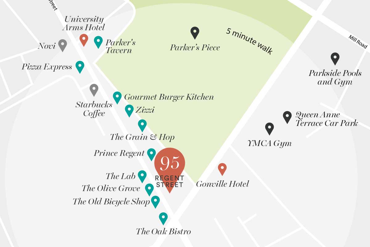 Strategically located at the junction of Hills Road, Regent Street and Gonville Place, 95 Regent Street is ideally positioned midway between the historic town, the university and the revitalised business district, which continues to evolve around the city’s central rail station. Hills Road, Regent Street and the immediate surrounding area provide excellent amenity offerings, including cafés, bars, restaurants, hotels, leisure facilities (gym, swimming, yoga) and open green space.