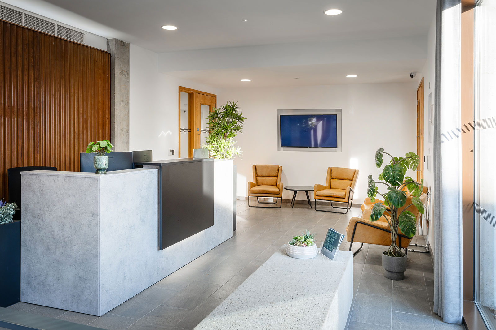 The refurbishment works at 95 Regent Street involved the replacement of two former entrances to the building with a large, reoriented reception area, ‘turning’ the building to address pedestrians travelling south-north from Cambridge central station. The light, bright lobby transforms this prominent corner and opens the building up with a feature wall and building signage within and above.